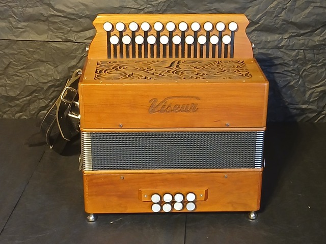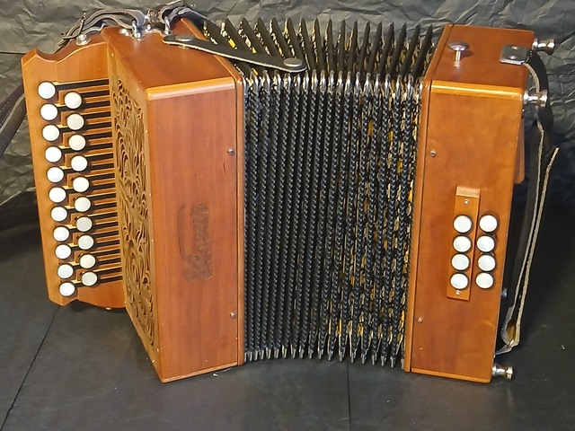 Main droite : 2 Rangs, 21 boutons, 2 voix (2 Flûtes), accordage swing.