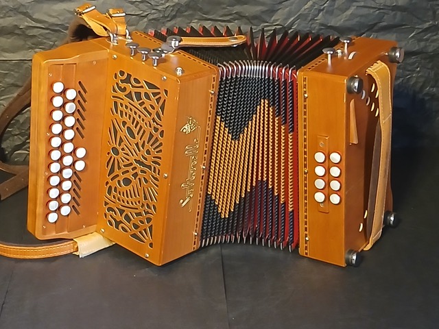 Accordéon diatonique d’étude Accordéon diatonique d’étude Main droite : 2 Rangs (21 boutons), 2 voix. vibrato : swing. Main gauche : 8 basses, avec registre de suppression des tierces. Entretenu, révisé à l’atelier. Vendu avec sac et bretelles. Le...